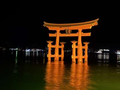 夜のお散歩でライトアップされた大鳥居を見ました。対岸のあかりも幻想的ですてきでした。