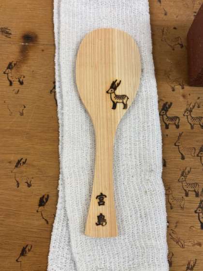 サンダーでしゃもじにヤスリをかけて、滑らかにしたあと、思い思いの焼き印をつけます。世界に一つだけのオリジナルのしゃもじを持って帰ります。