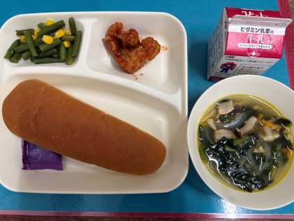 今日の給食は、「コッペパン、ブルーベリージャム、牛乳、まぐろのオーロラ煮、スープ、さんどまめとコーンのサラダ」でした。