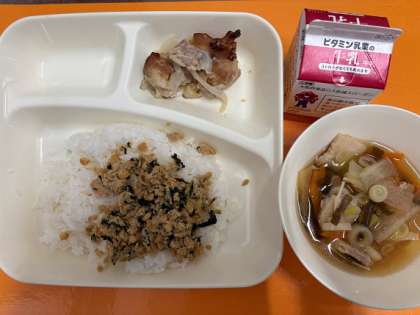 今日の給食は、ごはん、牛乳、鶏肉の柚子塩焼き、ソーキ汁、ツナ大豆そぼろ」でした。