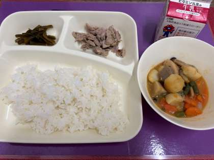 今日の給食は、「ごはん、牛乳、豚肉の梅風味焼き、ふきよせ煮、くきわかめのつくだ煮」でした。