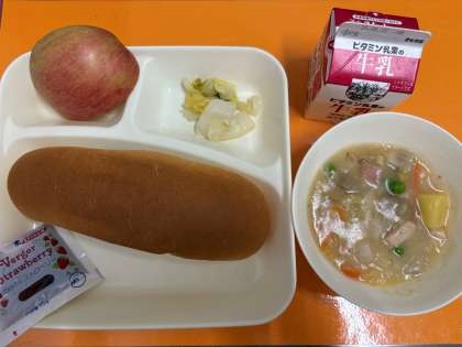 今日の給食は、「コッペパン、いちごジャム、牛乳、鶏肉とさつまいものシチュー、はくさいのピクルス、りんご」でした。