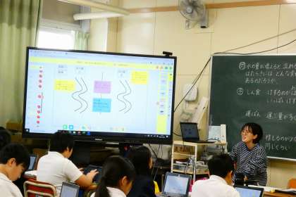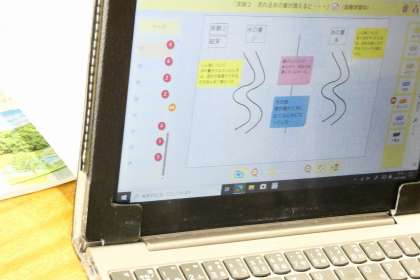 みんなでコラボノートに自分の考えを記入して、協働学習中です。