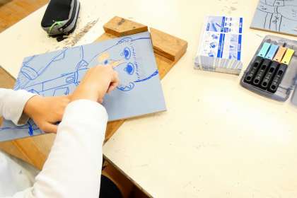 版画に取り組んでいます。「リコーダーを吹く私」です。
