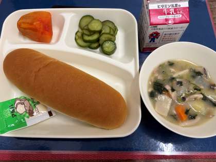 今日の給食は、「コッペパン、マーガリン、鶏肉ときのこのシチュー、きゅうりのピクルス、かき」でした。