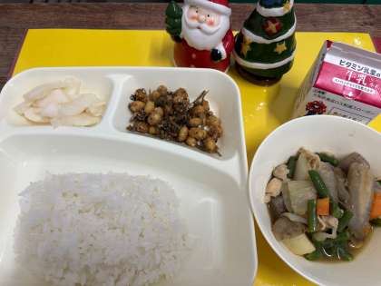 今日の給食は、「ごはん、牛乳、鶏肉と野菜の煮物、じゃこ豆、かぶのゆず風味」でした。