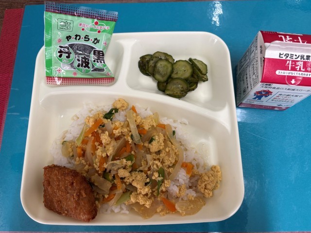 今日の給食は、「カツ丼、牛乳、きゅうりの赤じそあえ、ソフト黒豆」でした。