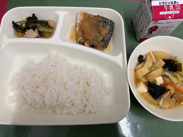 今日の給食は、「ごはん、牛乳、さばのおろしじょうゆかけ、五目汁、こまつなの煮びたし」でした。