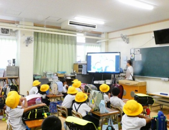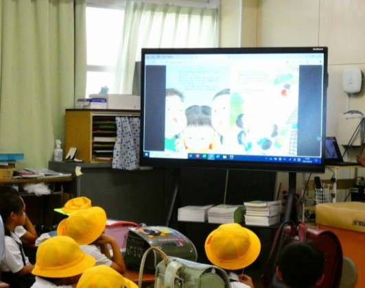 大きなモニターに映し出された挿絵を見ながら、先生の読み聞かせです。