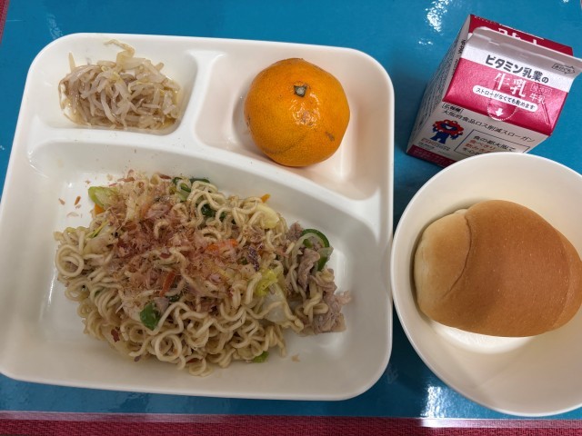 今日の給食は、「ミニコッペパン、牛乳、和風焼きそば(かつおぶし)、もやしのしょうがづけ、みかん」でした。