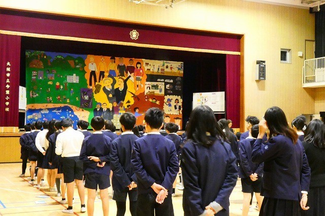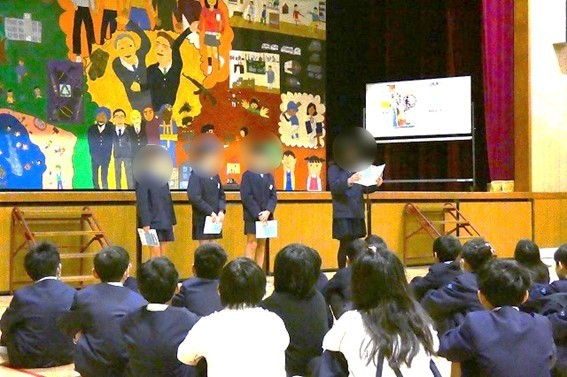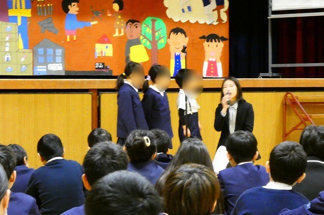 6年生は2学期の思い出について作文を全校児童の前で読み、1年生は「2学期、楽しかったことは何ですか?」のインタビューに答えていました。