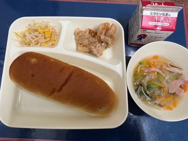 今日の給食は、「おさつパン、牛乳、鶏肉のからあげ、ハムと野菜の中華スープ、もやしとコーンの中華あえ」でした。