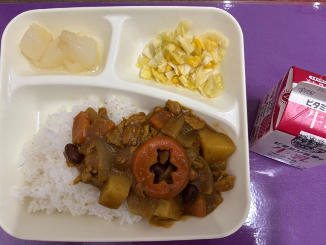 今日の給食は、「豚肉と金時豆のカレーライス、牛乳、サワーソテー、和なし(カット缶)」でした。