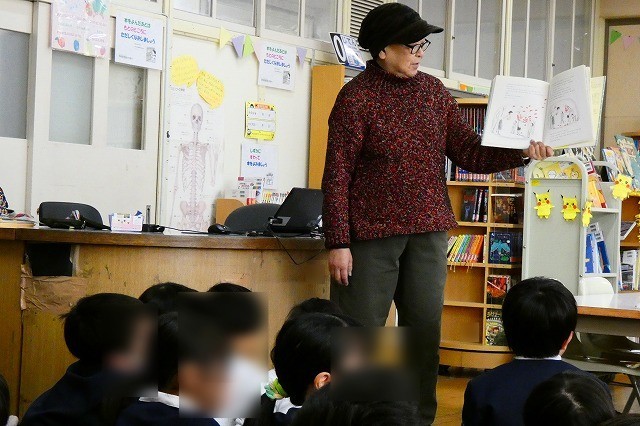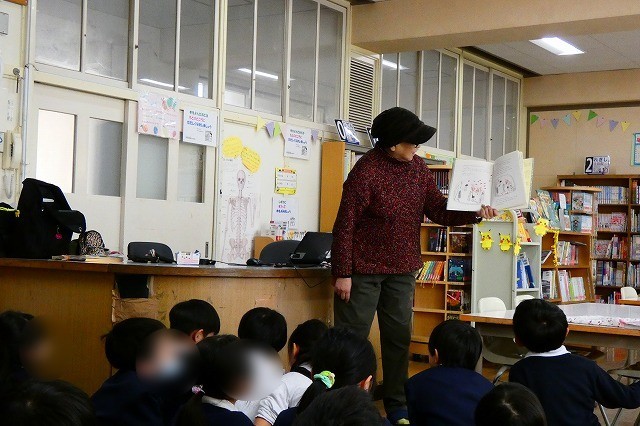 図書の時間に学校司書の先生が読み聞かせをしてくださってます。