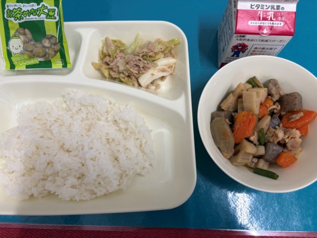 今日の給食は、「ごはん、牛乳、筑前煮、ツナとキャベツのごまいため、まっ茶大豆」でした。