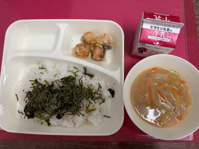 今日の給食は、「こまつ菜っ葉めし、牛乳、さけの和風マリネソースかけ、じゃがいもとベーコンのみそ汁」でした。