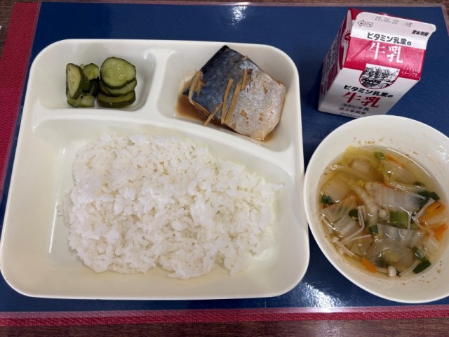 今日の給食は、「ごはん、牛乳、さばのみそ煮、五目汁、きゅうりの甘酢づけ」でした。