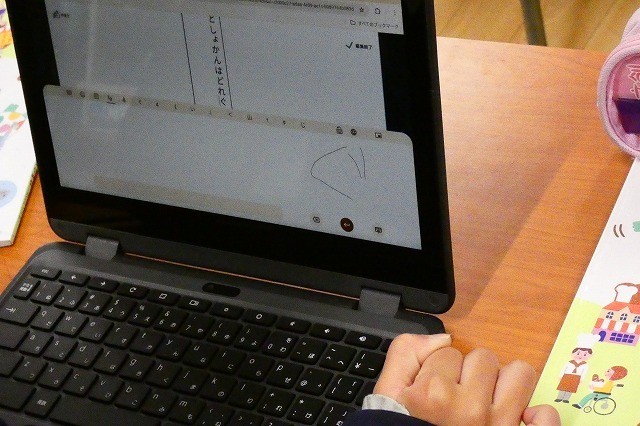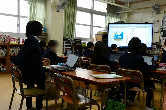 図書館の工夫について、発表しています。入力は文字を直接入力すると、自動で変換してくれます。3年生になったら、ローマ字入力に移行していきます。
