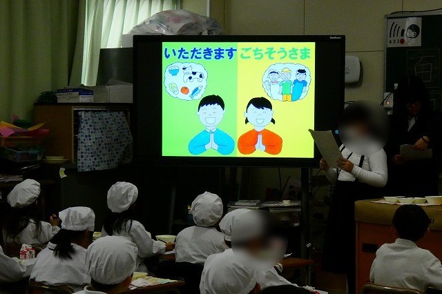給食の時間に給食委員会の児童が各クラスを訪問し、「いただきます・ごちそうさま」についての話をしました。