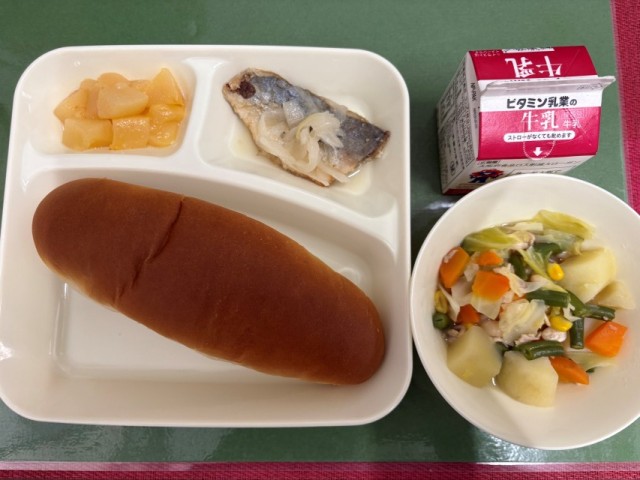 今日の給食は、「黒糖パン、牛乳、あじのレモンマリネ、てぼ豆のスープ煮、白桃(カット缶)」でした。