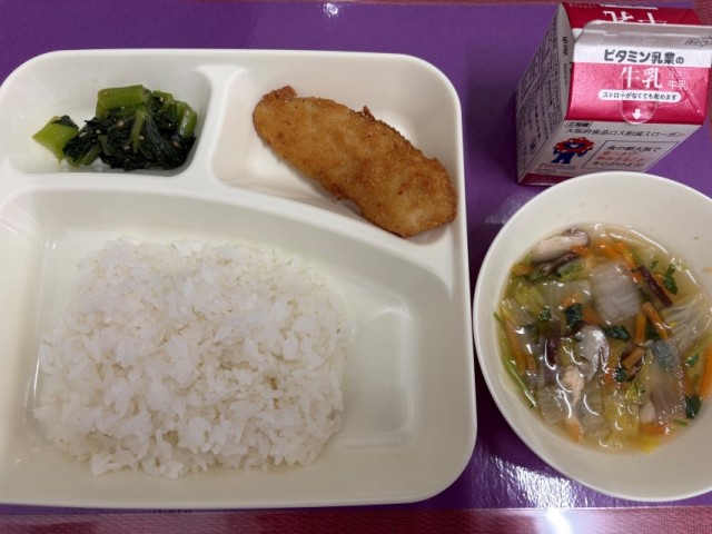 今日の給食は「ごはん、牛乳、たらフライ、うすくず汁、こまつなのごまあえ」でした。