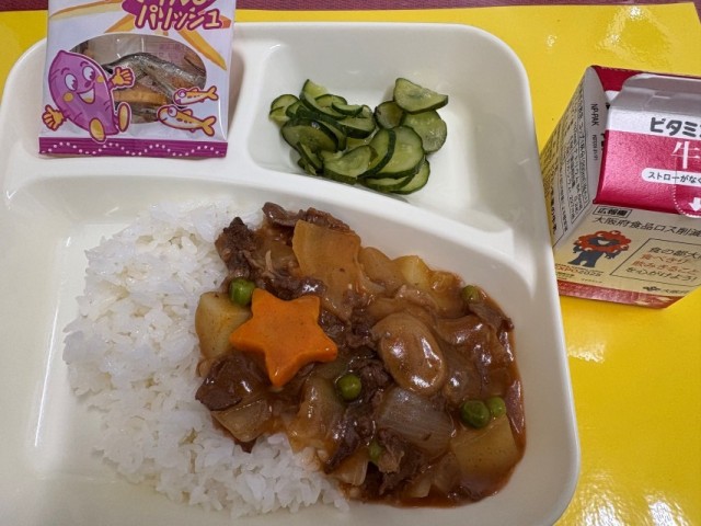 今日の給食は「ハヤシライス、牛乳、きゅうりのバジル風味サラダ、いもけんぴフィッシュ」でした。
