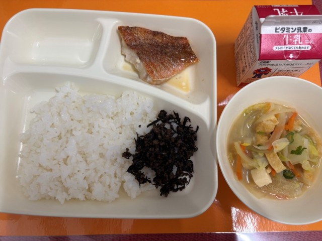 今日の給食では、「ごはん、牛乳、あかうおのレモンじょうゆかけ、みそ汁、牛ひじきそぼろ」でした。