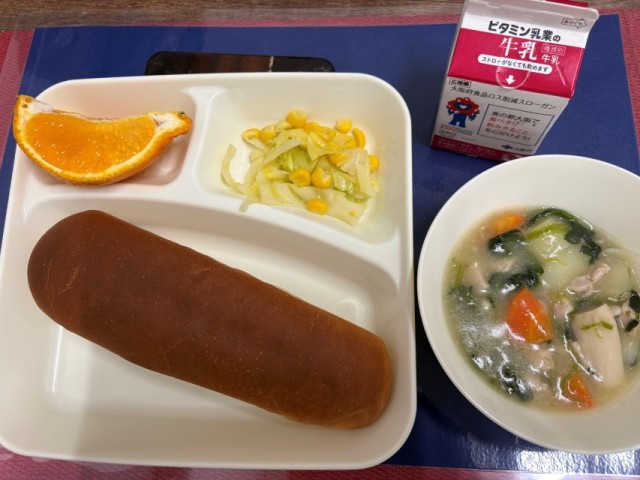 今日の給食は、「黒糖パン、牛乳、鶏肉とほうれんそうのシチュー、キャベツとコーンのサラダ、デコポン」でした。