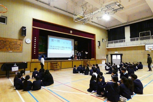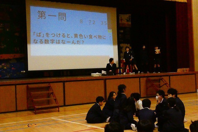 児童集会で「クイズ」をしました。問題が大きなスクリーンに映し出されると、一生けんめい班で答えを考えます。