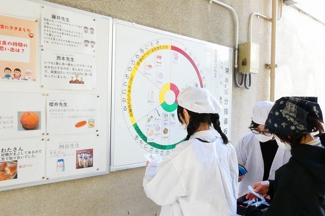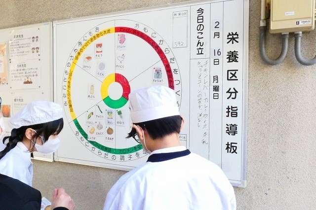 給食委員の活動です。毎日の献立を給食室前の大きな「栄養区分指導板」に給食に使われている食材を栄養素ごとに分類して貼っていきます。おいしく作っていただいている給食は、毎日、完食。どの学級も食缶を空にして返しに来ます。感謝していただいています!