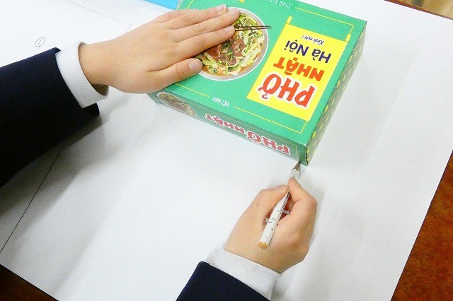 それぞれが家庭から持ってきた「箱」を調べます。すべての面を画用紙に写し取り、いくつあるか数えました。