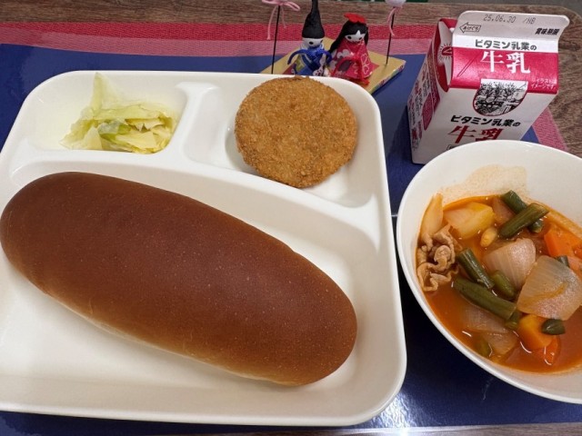 今日の給食は、「黒糖パン、牛乳、チキンレバーカツ、ケチャップ煮、キャベツのサラダ」でした。