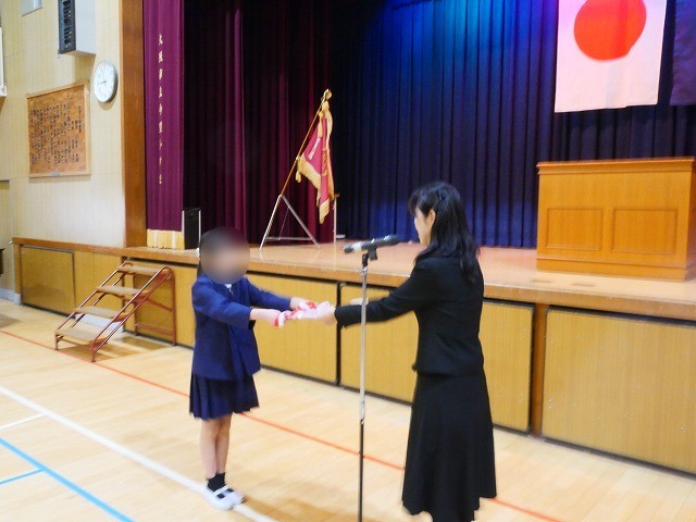 令和7年度の修了式を行いました。在校生の代表として5年生の代表児童に修了証を渡しました。