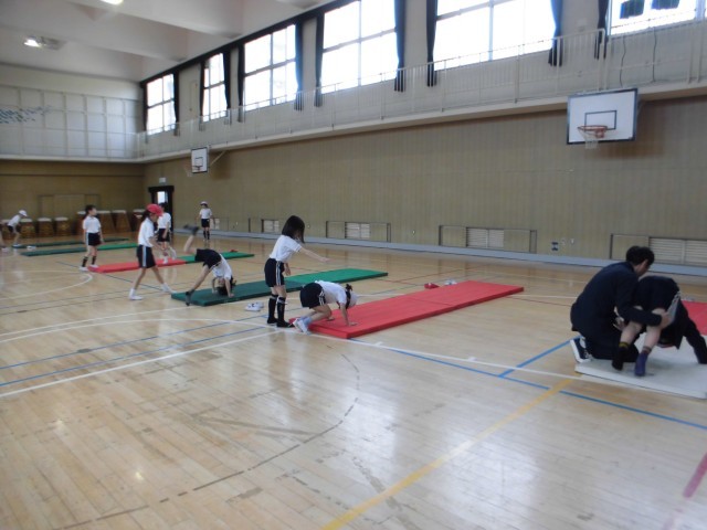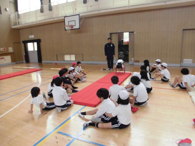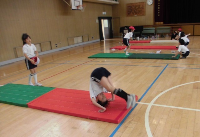 体育館で3年生が前転の練習をしています。手をウサギの耳のようにおき、マットの上でくるり。上手に回れたときは、みんな得意げです。