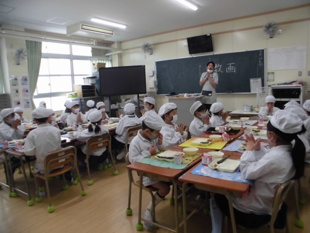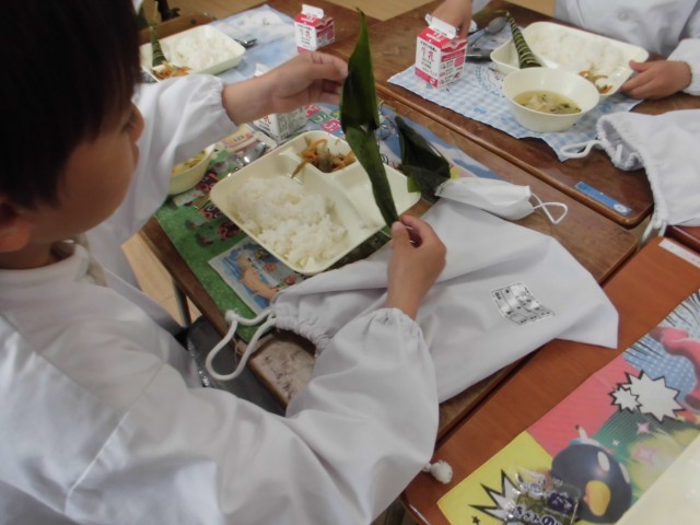 今日の給食には「こどもの日の行事献立」として「ちまき」がつきました。ちまきのような季節行事に関わりのある食べ物に触れることも大事な食育のひとつです。2年生の教室でも先生からの説明を聞いて、おいしくいただきました。