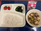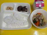 今日の給食は、「ごはん、牛乳、くじらのたつたあげ、豚肉とじゃがいもの煮もの、白...