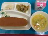 今日の給食は、「コッペパン、マーガリン、牛乳、豚肉のカレー風味焼き、コーンスー...