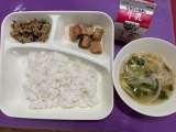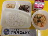 今日の給食は、「ごはん、牛乳、一口がんもとさといものみそ煮、牛乳と野菜のいためも...