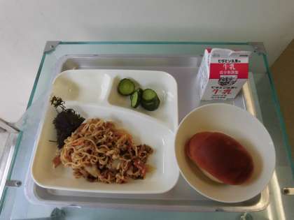 焼きそば・きゅうりのしょうがづけ・1/2黒糖パン・牛乳です。