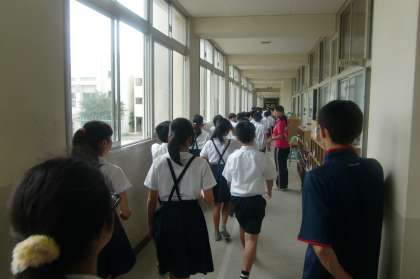 地震発生のサイレン・放送がなると、子どもたちは机の下へ入り、自分の身の安全を確保しました。その後、津波発生のサイレン・放送で、校舎の3階へと避難しました。