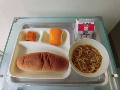 カレースープスパゲッティ・焼きかぼちゃ・あまなつかん・黒糖パン・牛乳です。