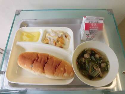今日の給食は、マカロニ、牛乳、粉末チーズを使用したマカロニグラタンです。