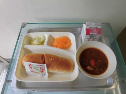 ビーフシチュー・キャベツのピクルス・みかん(缶)・コッペパン・牛乳です。