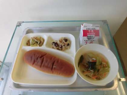 金時豆の中華おこわ・中華スープ・ツナと野菜のオイスターソースいため・黒糖パン・牛乳です。