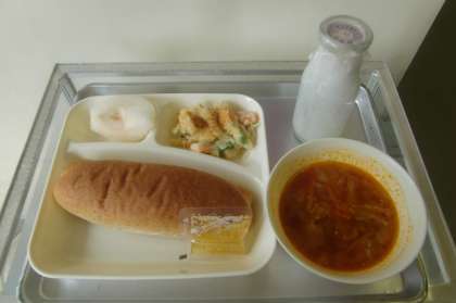 えびグラタン・トマトスープ・なし(豊水)・ライ麦パン・牛乳
