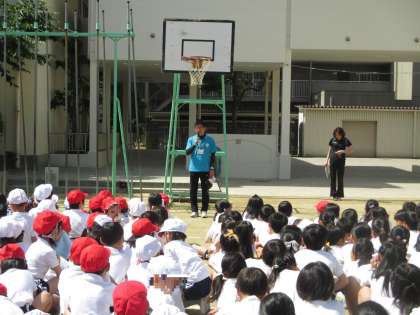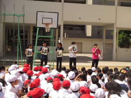 給食室から火災が発生したという設定で、運動場に避難しました。
