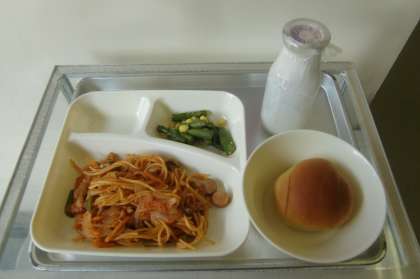 「イタリアンスパゲッティ」は豚肉・ウインナーを主材に、ケチャップ・トマトピューレ・ウスターソースなどで味付けします。子どもたちに毎回好評な献立です。