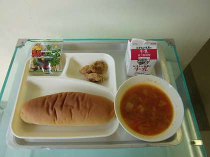 一口トンカツ・ミネストローネ・豆こんぶ・黒糖パン・牛乳です。