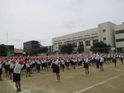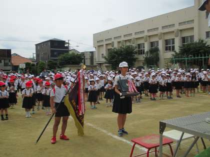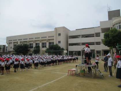 運動会当日、雨のため閉会式ができなかったため、本日臨時の全校朝会を行い、その中で「おわりの体操」〜「閉会式」を行いました。