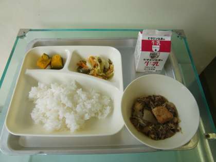 すき焼き煮・焼きかぼちゃ・野菜のそぼろいため・ご飯・牛乳です。